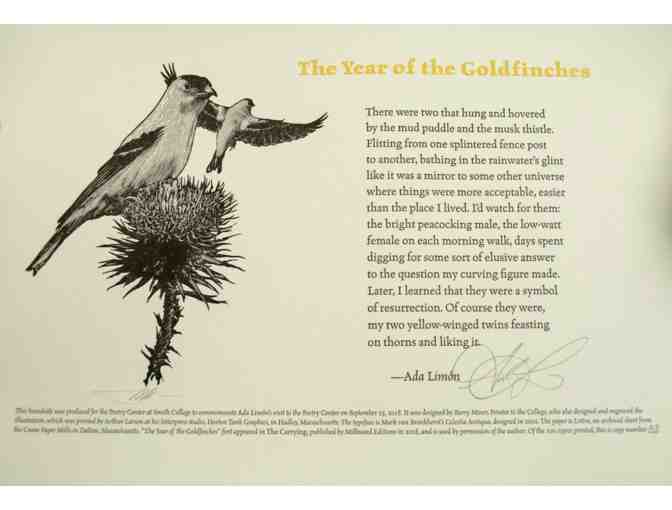 We are pleased to share with you an original work of distinguished artist Barry Moser, who has been creating limited edition fine letterpress broadsides alongside the Poetry Center at Smith College. Moser is esteemed in his field, and has worked on notable projects such as Moser’s 1982 Alice’s Adventures in Wonderland (winner of the 1983 American Book Award for Design and Illustration), Mary Shelley’s Frankenstein, and an edition of the King James Bible--the first such endeavor undertaken by a single artist since Gustave Doré illustrated La Sainte Bible in 1865.