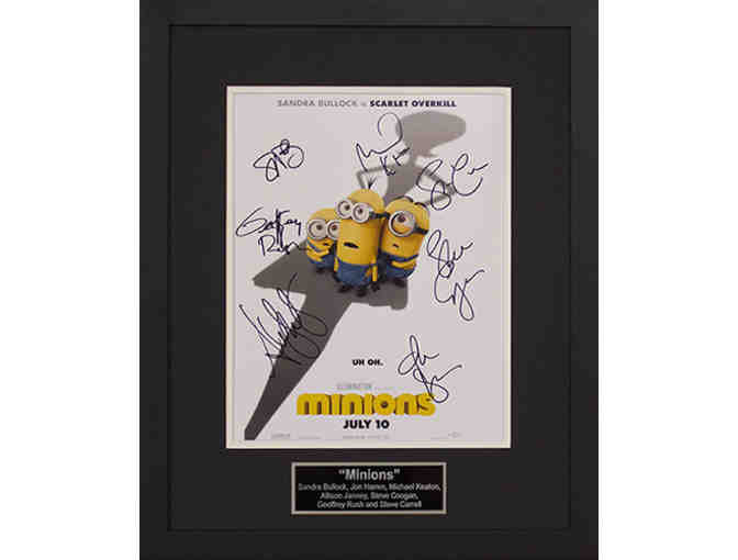 Do you want to own a despicable piece of art? Now you can with this 11x14 creatively framed and matted artwork from the “Minions”. Sandra Bullock, Jon Hamm, Michael Keaton, Allison Janney, Steve Coogan, Steve Carrell and Geoffrey Rush have all signed this out-of-this-world treasure! Special black matting insures it coordinates with any décor.
