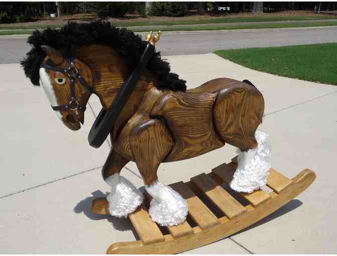 This one-of-a-kind custom-built Clydesdale rocking horse is 48” long and 36” high at the top of the head. It weighs approximately 50 pounds.