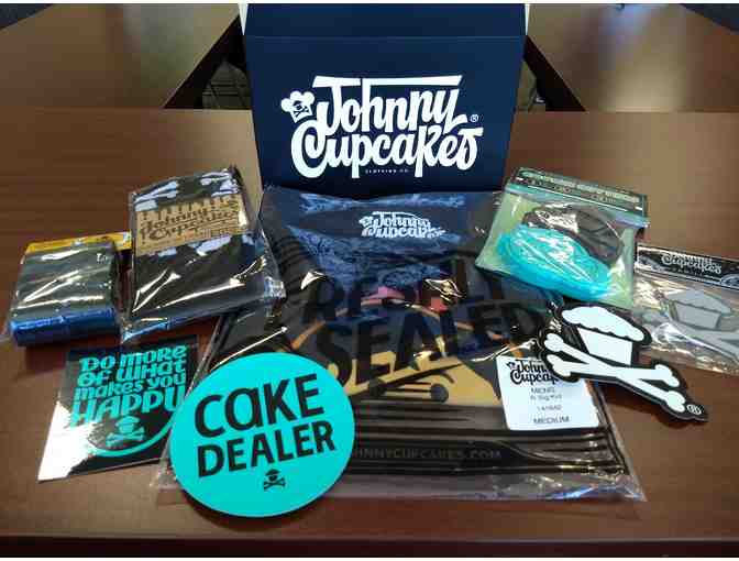 Enjoy several items of Johnny Cupcakes merchandise, including a Men's Medium T-shirt, Cookie Cutters, Socks, Pet Waste Bags, Air Freshener, 3 Stickers, and a Bakery Box.