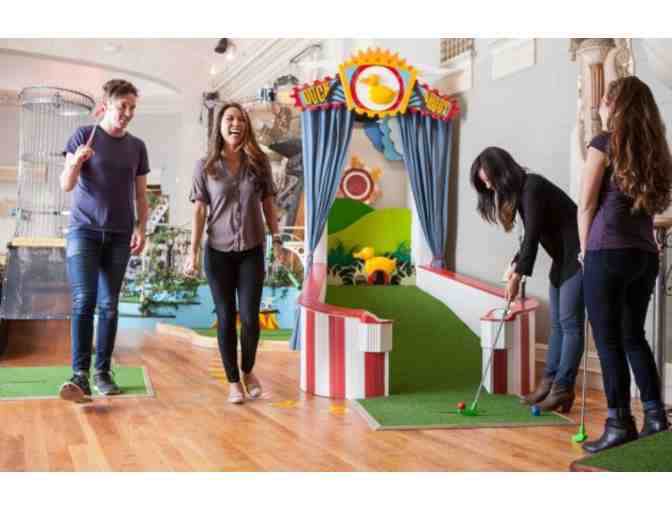 Fun, quirky, themed and INDOOR: Urban Putt offers a great location, good food and drinks and a game of indoor miniature-golf right in San Francisco! Eat, drink, and play 14 holes of mini-golf on a high-tech, whimsical course with plenty of room to set a drink down for your own happy hour! Play 2 games or invite a friend, sibling or date for a competitive game of mini golf you are sure to enjoy!