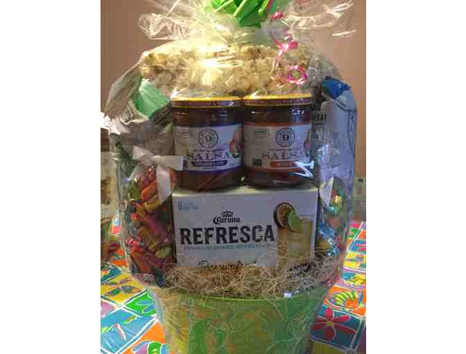 This is a beautifully put together food gift basket courtesy of Mann Orchards. The basket contains Sam Adams Porch Rocker, fruit slices, No.9 tortilla chips, Seaside kettle corn, Corona Refresca passion fruit, Corono Refresca guava, No.9 salsa, and No.9 black bean & corn salsa.