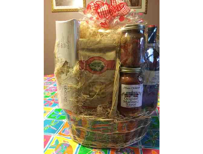 This is a beautifully put together pasta dinner gift basket courtesy of Mann Orchards. The basket contains jars of sauce, various pasta types, and a bottle of wine.