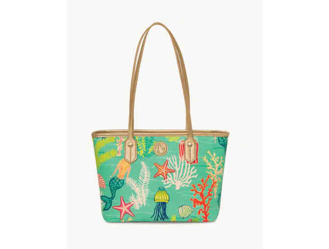 This medium tote is the perfect size for any occasion whether it be shopping or lunch by the water. With textured vinyl trimmed in genuine leather, you are ready for the nearest resort. The bag features a top zip closure, double shoulder straps, and satin interior lining with one zip and two slip pockets. This bag is bright and beautiful. Embrace your inner mermaid.