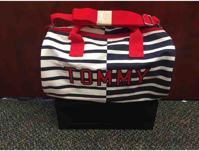 Tommy Hilfiger duffle bag with navy, red and white striped designs. Features double handles and a removable strap and contains 2 slip interior pockets.