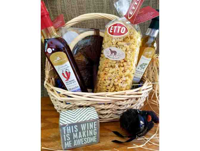 Lots of gourmet goodies here. Two bags of local Etto pasta, a fennel olive oil, a red pepper olive oil, a gorgeous pottery dish for your olive oil serving, garlic, cute sign and even a wool Tablas Creek sheep mascot for your kitchen!
