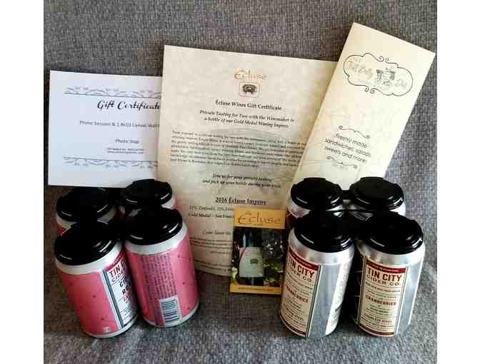 Lots to see here! A $25 gift card to the yummy Full Belly deli, a Private tasting for two guests with the winemaker at Ecluse Wines + you'll receive a bottle of their award winner Improv wine on your visit, a photo session at Photo Stop along with one 8x10 canvas wall hanging and two four packs of Tin City Cider.