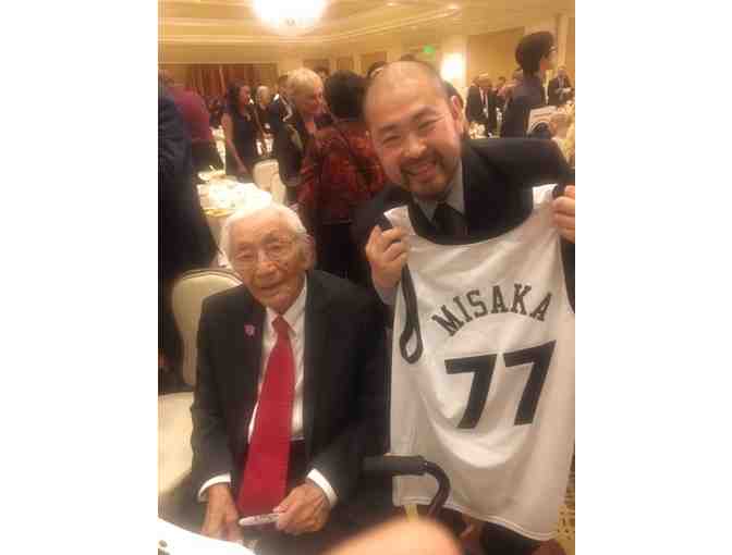 This autographed throwback jersey is a replica jersey produced by South Carolina-based Japanese American hip hop artist G Yamazawa in honor of Wataru “Wat” Misaka, who in 1947 became the first Japanese American and also first non-white basketball player in the NBA (then called the BAA) while playing point guard for the New York Knicks. The jersey is for Wat Misaka’s junior college team Weber College, with whom he won two championships. He then went on to play for Utah State, and won the NCAA championship in 1944. Wat Misaka autographed the jersey for Center staff member Haruka Roudebush this summer at the JACL National Convention in Salt Lake City, Utah.
