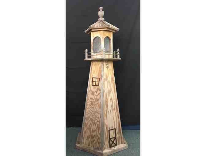 Place this unique wooden lighthouse lamp in a special place. The electric lamp is 4 feet tall with detailed features with frosted glass.