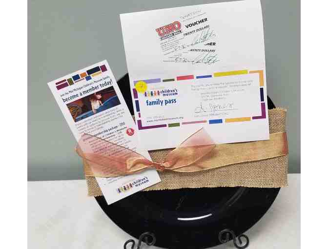 One Day Mid-Michigan Children's Museum Family Pass (4 people) and two $20 Uno Pizzeria & Grill gift cards.