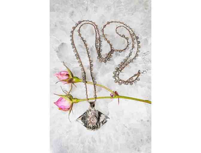 Double terminated crystal quartz with handmade sterling silver rose and feather detail. This piece is perfectly fitted on a 32" handcrochet labradorite and sterling silver necklace.