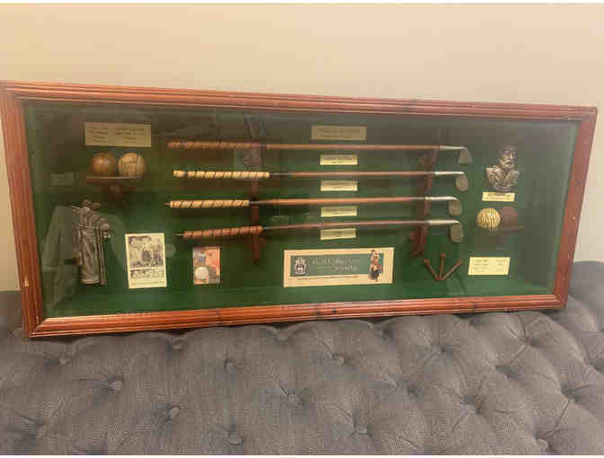 A shadowbox depicting the history of golf in America. The shadowbox, with scaled down replicas, details the evolution of golf clubs, tees, and golf balls. The display case also features images of Three Stooges in golfing stances and vintage advertisements.