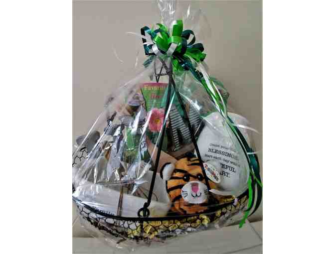 This unique gift basket is filled with local treats from Alabama. The chicken wire basket includes, an Alabama Hometown Cookbook, an oven mitt, a mini loaf pan set, a zoo animal key clip, a Jar of Blessings, Stir Crazy Spoons, and a metal "Home" sign