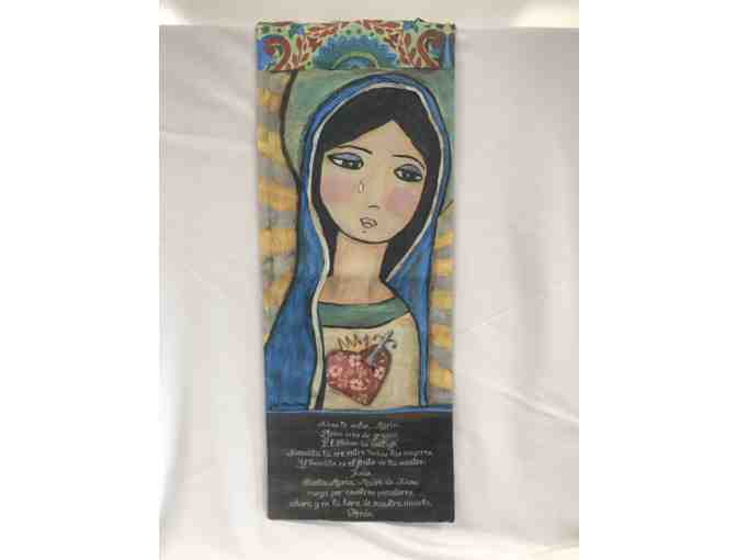 Made by manual woodworkers and weavers in North Carolina, this 13" x 36.5" wall hanging features Immaculate Mary and the Spanish "Hail Mary" prayer. Decorative wire hanger included.