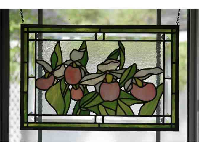 Reflecting the beauty of Minnesota's state flower, this 14x21 leaded stained glass lady slipper window is ready to capture light from a window in your home!
