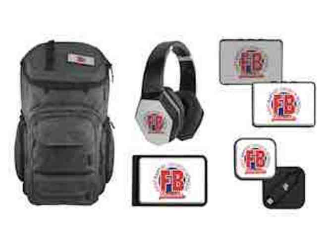 Personalized tech kit includes Backpack, wireless headphones, powerbank, wireless speaker, connector cord all with FBCS Logo