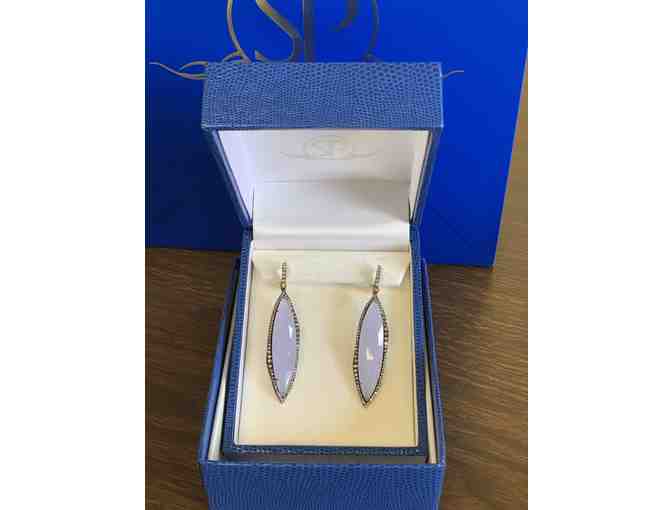 18K yellow gold & sterling silver earrings featuring elongated marquis shape blue quartz, surrounded by diamonds