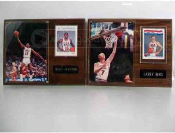 NBA Legends, Larry Bird and Magic Johnson Plaques with 1992 USA Olympic Team Cards.