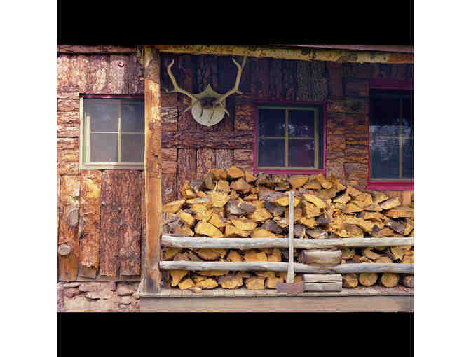 A classic Rocky Mountain cabin with delightful outer bark walls and colorfully painted windows. In Stonewall, CO. Barnwood frame/glazed.