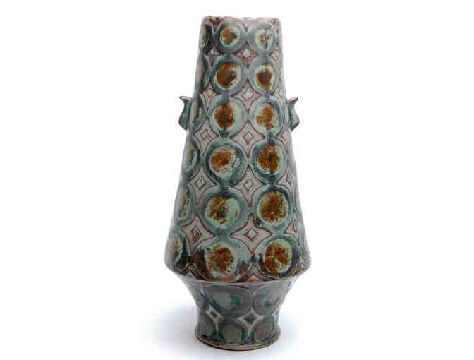 Porcelain, thrown ceramic vase with glazes applied in layers.