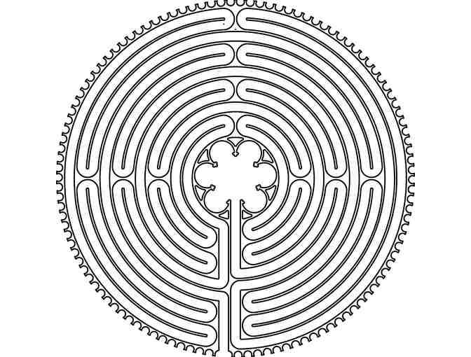 “Open” line drawing of Chartres labyrinth, 9” x 9” on white paper. Square border, credits Andy Olney for original CAD drawing. ABOUT THE CHARTRES DRAWINGS There are many uses for an accurate drawing of the Chartres labyrinth. They can be taken to Office Depot and laminated for a very modest price, giving you a durable finger labyrinth. While you’re there, you could have additional copies made, for this or other uses. People have paid $50 for my accurate CAD drawing of the labyrinth for making everything from lamp shades to pillows. You can scan this and use it in your literature, brochures, writings, or whatever. Originally I used a drawing made by Andy Olney. Subsequently, I made my own drawing with CAD, which I entered at full scale. Of course you can’t print out a 42-foot pattern very easily (although we did it in Minnesota, didn’t we Lisa?). It is the most accurate drawing that I have seen for the true dimensions and proportions of the Chartres labyrinth. The proportions are very specific and symbolic, so getting them right is important. You could also frame the drawing and just enjoy it. “Solid” means the pattern is colored in (black). “Open” means it is an outline.