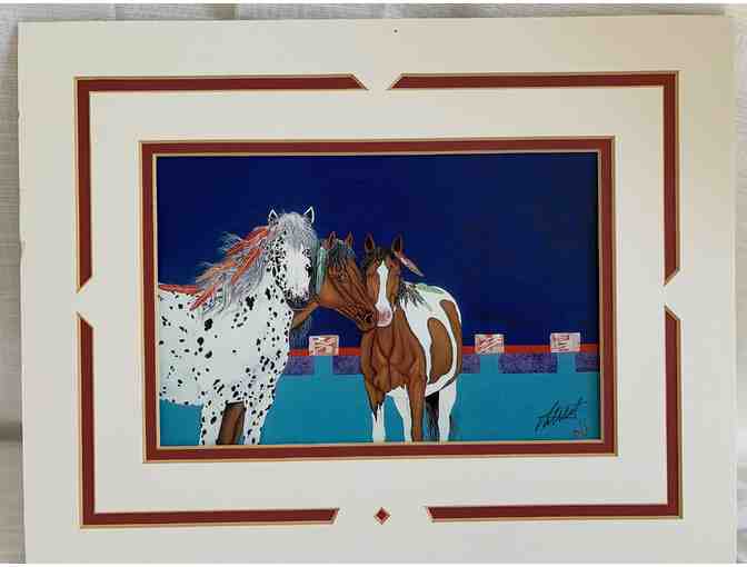 Artwork featuring a paint, appaloosa and bay horse, with colorful feathers in their manes under an intricate two-toned matte frame.