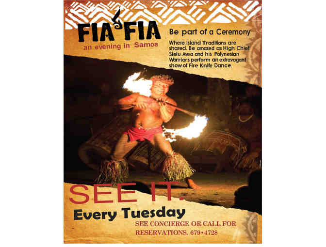 Gift certificate for two (2) to Marriott's Ko Olina Beach Club's Fia Fia Luau. Fia Fia is a unique luau experience that focuses on the beautiful cultures of Polynesia. Held every Tuesday night on the Great Lawn at Marriott's Ko Olina Beach Club on Oahu.