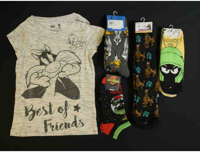 Proudly wear your love of Looney Toons and Scooby-Doo! with this collection of socks and a t-shirt.