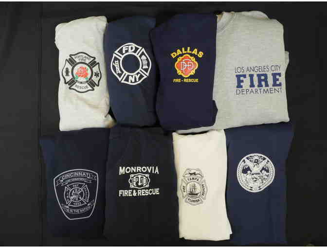T-shirts represent Dallas Fire & Rescue, Monrovia Fire & Rescue, FDNY, Tampa (FL) Fire & Rescue, San Francisco Fire Department, and Portland Fire & Rescue.