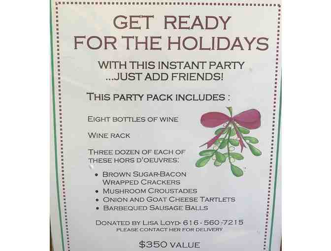 Enjoy this party package crafted by Lisa Loyd! It includes 8 bottles of wine in a wine rack with three dozen of each of the following hors d'oeuvres: