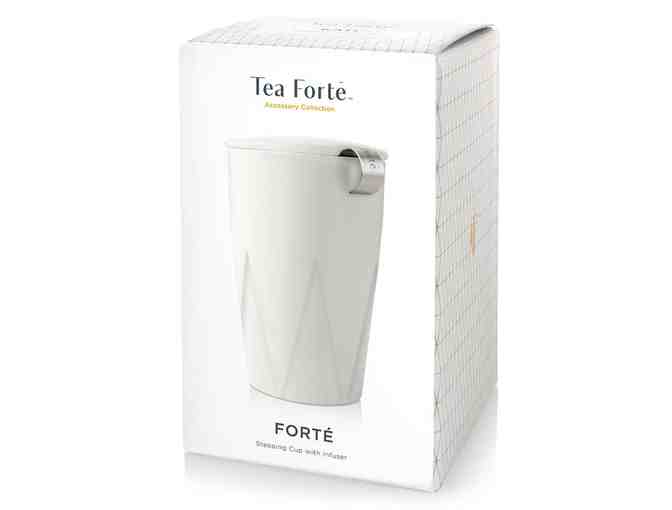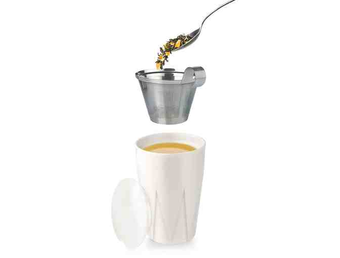 Loose tea by the cup.....simple. Tea Forte's double-walled ceramic tumbler and integrated stainless steel infuser make steeping loose tea by the cup simple. The innovative double-wall construction keeps the tea hot and the tumbler cozy to hold. Add the lid to your cup while steeping. When done, remove and use as a tray for your infuser basket.