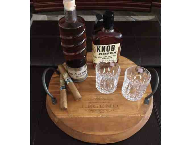 This package is for the Bourbon Whiskey lover. It includes a bottle of American Barrels Bourbon Whiskey, Knob Creek Kentucky Straight Bourbon Whiskey, 2 sipping glasses, 2 Gurkhas cigars and a beautiful serving board engraved by LARC participants.