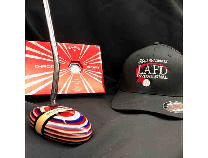 Also included, a fun LAFD Invitational cap, a blue club cover and sleeve of golf balls.