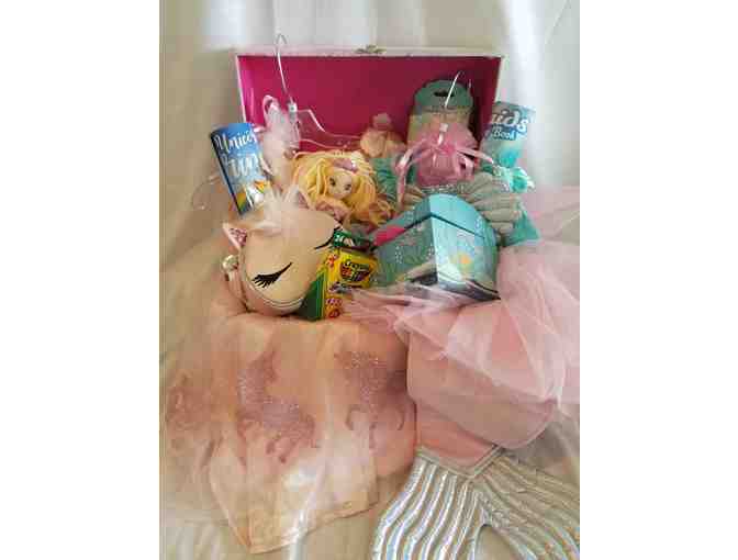 Basket includes: Sparkly unicorn dress, mermaid costume, coloring books and crayons, mermaid doll, unicorn purse, and more!