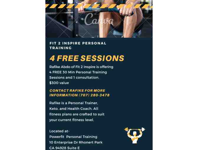 This item is for (4) 30 minute personal trainer sessions and one consultation with Rafiki Abdo.