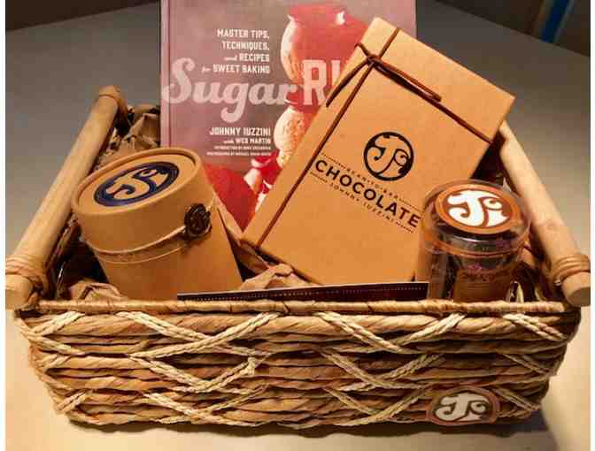 A basket stuffed with a selection of Chef Johnny Iuzzini's single origin bean to bar chocolate creations including bars, chocolate covered candied nuts and fruits, soft chocolate caramels and a personalized copy of his cookbook Sugar Rush.
