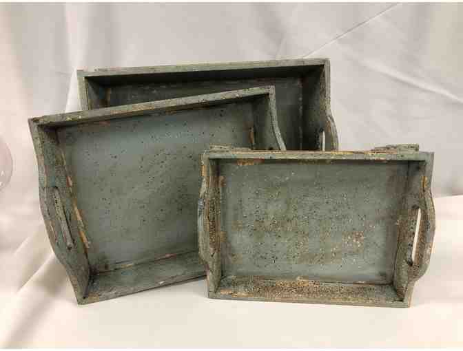 Set of three wooden, distressed nesting trays in light teal.