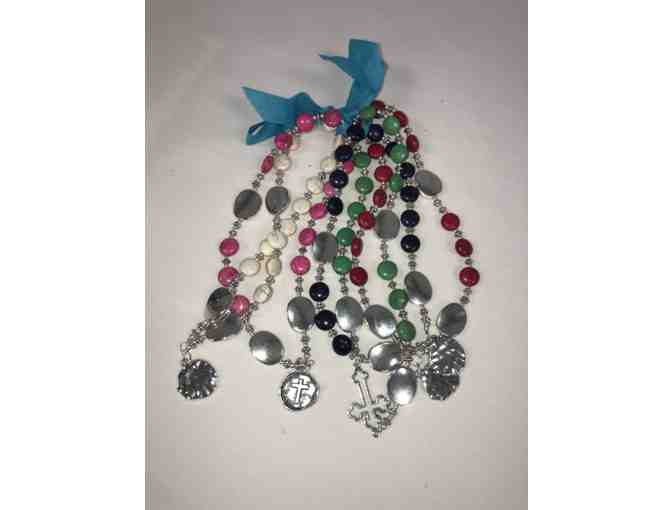 Five chaplets for the Liturgical Year: Howlite beads dyed green, purple, pink, white, and red. Surrounded by silver-plated spacer beads. Silver-plated pater beads and crosses. Blessed by Fr. Jack Gleason, and handmade in Tulsa.