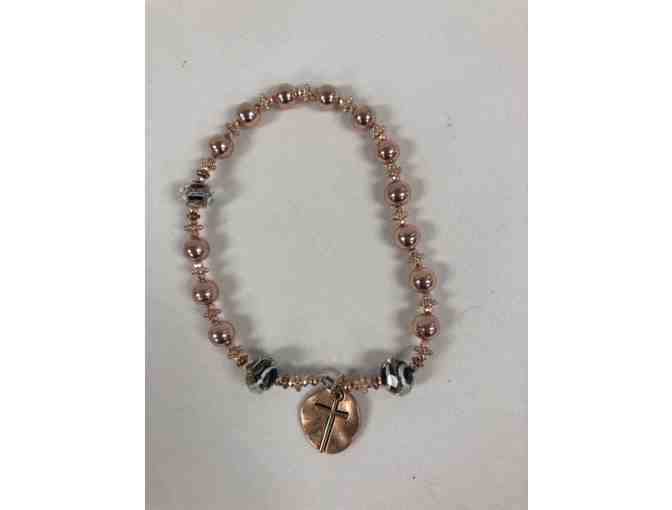Rose gold hematite chaplet with glass copper, white, black swirl pater beads, and a copper and brass-toned cross. Blessed by Fr. Duy Nguyen and handmade in Tulsa.