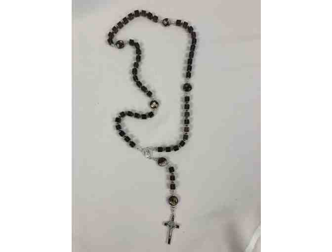 Cubed smoky quartz Ave beads with brown variegated forget-me-not and various silver-plated spacer beads. Uniquely striated agate lozenge Pater stones for Paters. Brown Benedictine crucifix/Sacred Heart of Jesus center. Blessed by Dcn. Rich Bender and handmade in Tulsa.