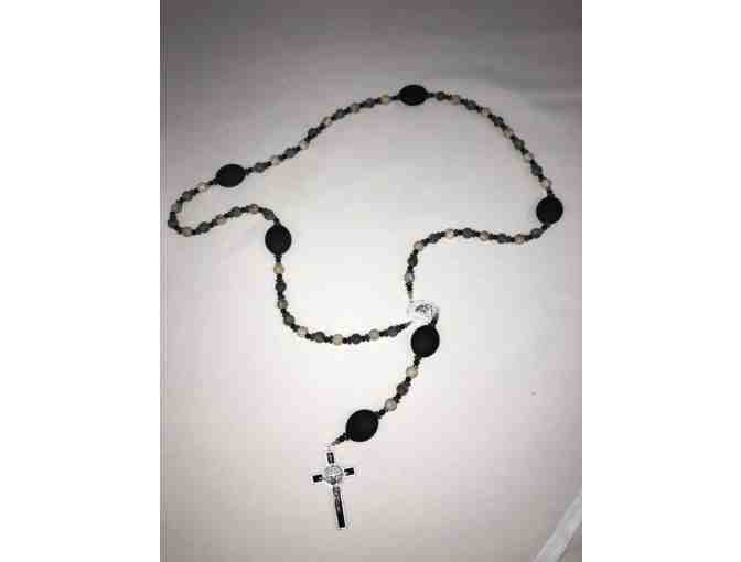 Green African turquoise, beige African opal for Ave beads; black rubbery-coated glass beads for Pater beads. Unpolished black onyx, bronze, and hematite spacer beads. Black Benedictine crucifix, Sacred Heart of Jesus center. Blessed by Dcn. Rich Bender and handcrafted in Tulsa.