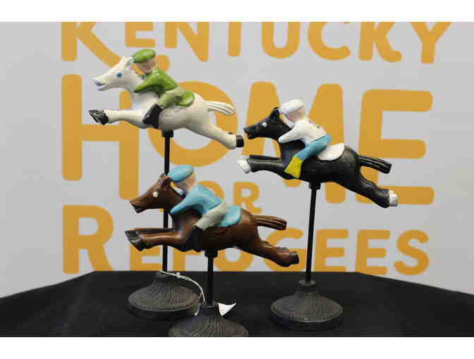 Bring home a bit of the Bluegrass with this beautiful racing horse trio decor! This charming set of race horses and jockeys will liven up any room in your home. You'll want to place your bets quickly on this package!