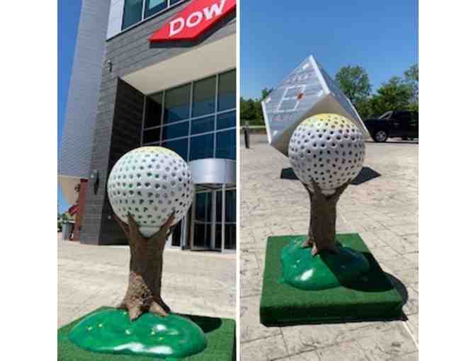 Peggy Conlin and Delores Ford-Heinrich have enjoyed their collaboration in creating the “Growing a Healthy Midland” sculpture. As first time participants in the Downtown Sculpture Series, Peggy and Delores have drawn on their many years of creative experience and talents to imagine and construct this sculpture. Look carefully, each golf ball dimple has a 1” painting of a fruit or vegetable that is grown in the Midland area.”