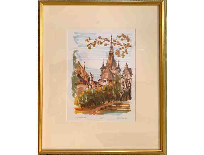 This limited edition print is signed and numbered by the artist. It was created from his original drawing, drawn near the hotel in Budapest where the artist stayed. This scene is of structures that appear to be from 15th century. The artist concentrated on the shape of the roofs, steeples, architectural elements and warm colors.