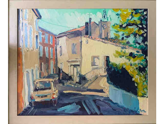 This lovely oil painting depicts a scene of a casual French street. With vibrant colors and intense textures, this piece would make a beautiful addition to any home.