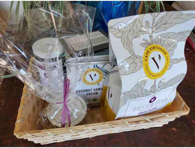 Beach Plum Kitchen in Carlsbad, CA offers homemade, fair-trade, organic, from-scratch recipes for breakfast and lunch. This is a basket, for local pick-up only, that not only includes a $100 gift certificate but Plum Jam, Organic House Blend coffee, Blueberry Lemon jelly, and Organic Coconut Vanilla Cream.