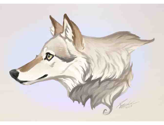 5x7. A simple, stylized wolf portrait with calm, muted colors.