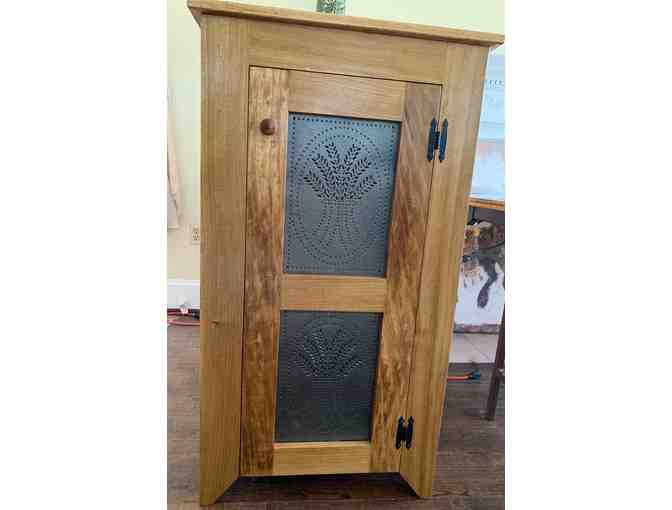 Handcrafted pie safe inspired by early American furniture. This unique piece is made of poplar stained in a golden oak. Punched tin doors conceals 3 shelves. This piece would work wonderfully has a storage solution for kitchen, hallway, or any living space.