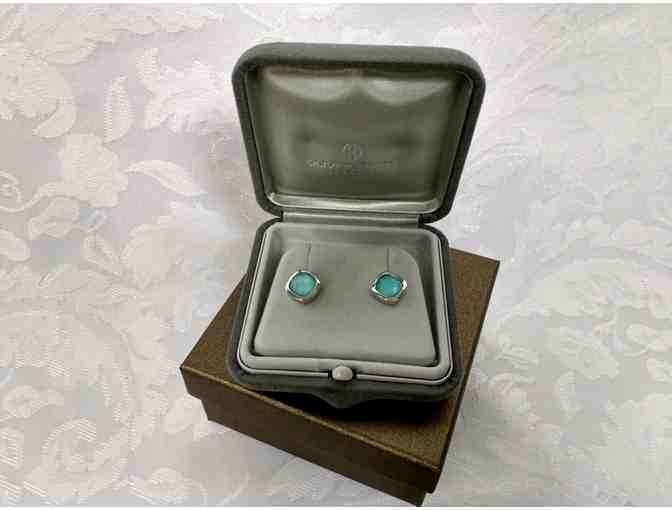 Custom Sterling Silver Stud Earrings. The earrings consist of a bezel set 8mm cushion shape checkerboard cut Turquoise and Crystal quartz doublet. Finished in high polish rhodium with post and clutch back.