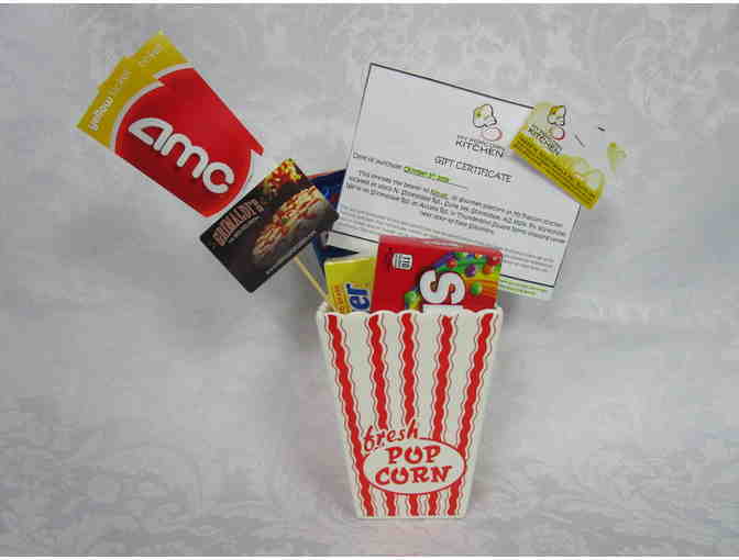Grimaldi's $50 Gift Card, 2 AMC Movie Tickets, My Popcorn Kitchen $20 Gift Cert, Ceramic Popcorn container, movie candy